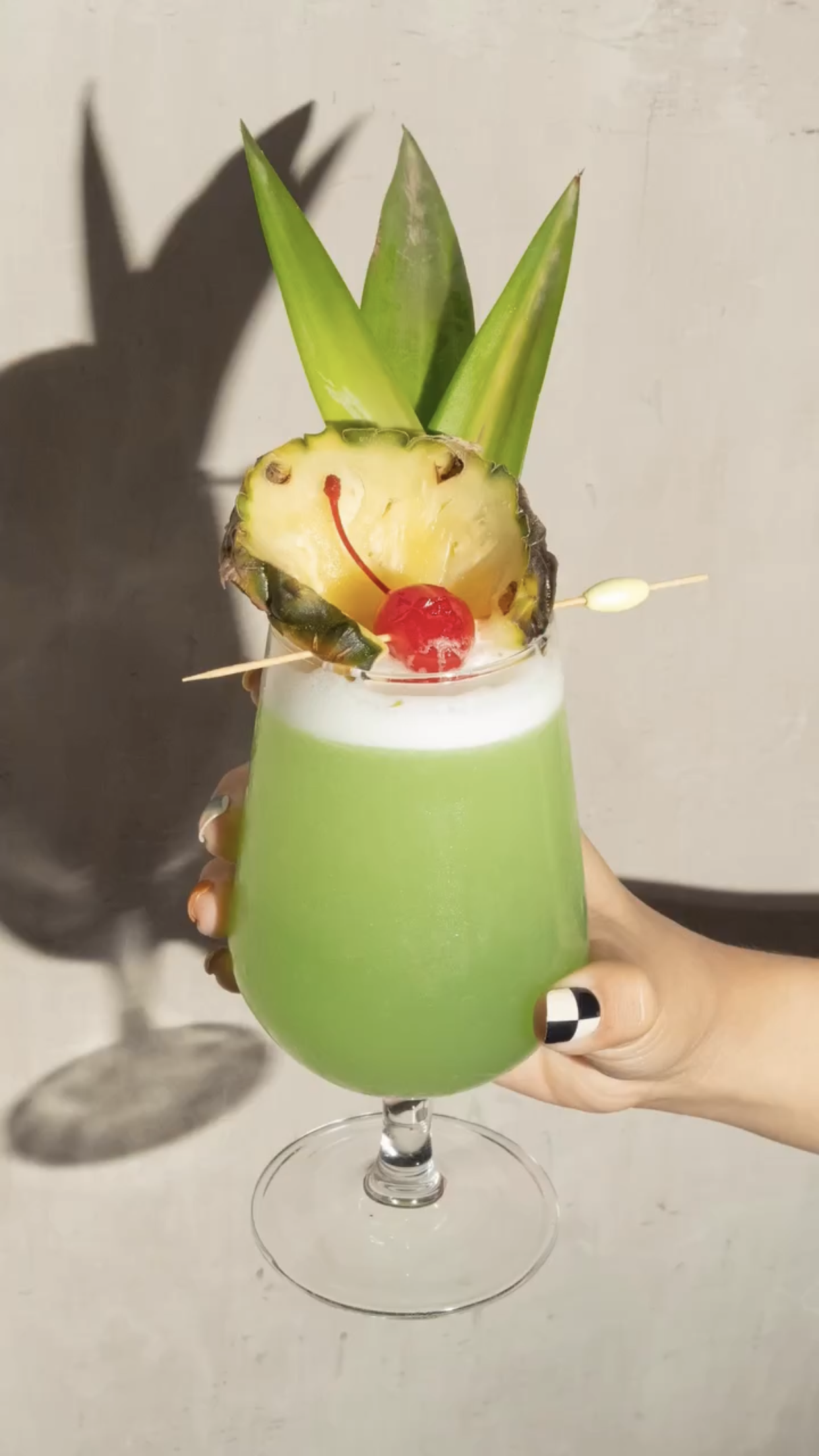 A fruity, herbal, and refreshing drink that includes rum, fruit liquer, fruit juice, and herbs. Garnished with dried pineapples and pineapple leaves.